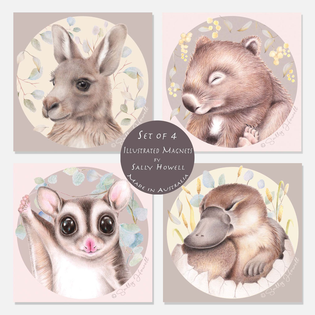 This set features Lil Grey Roo, Sleepy wombat, Sugarglider & Platypus Hatchling.
