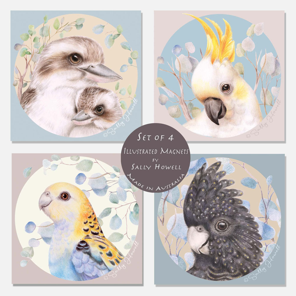 This set features Kookaburras, Sulphur Crested Cockatoo, Pale Headed Rosella & Black Cockatoo.
