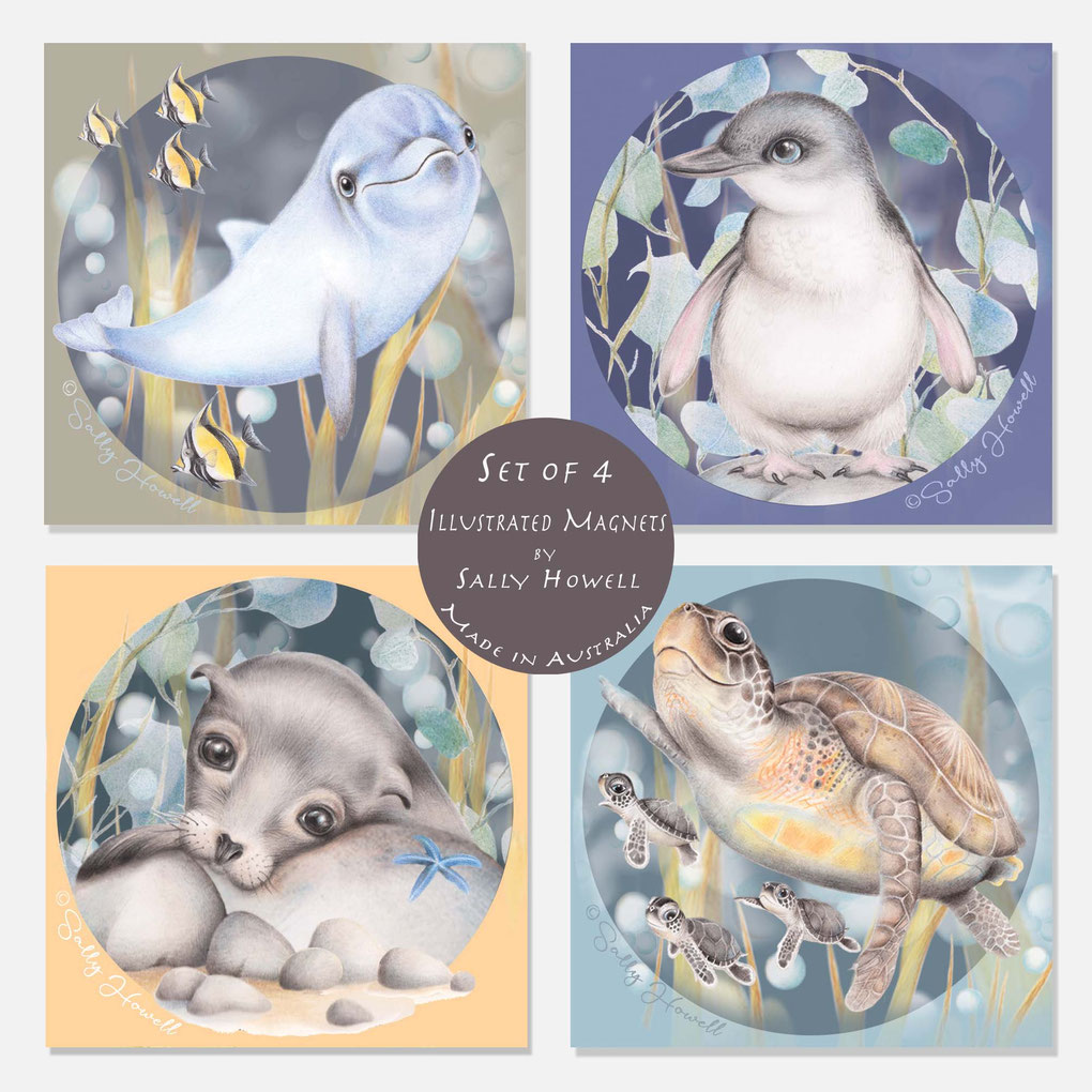 This set features Dolphin, Fairy Penguin, Seal & Green Turtle Family