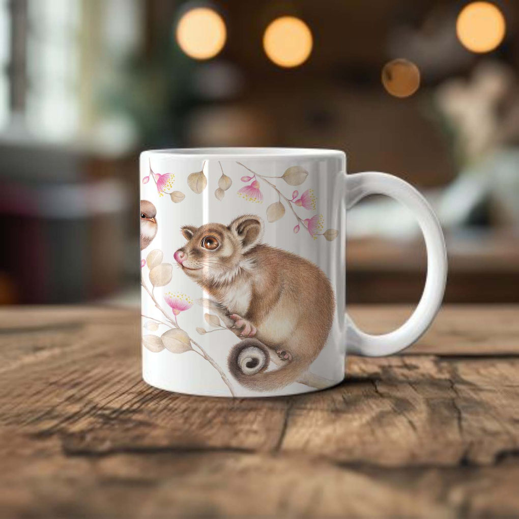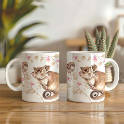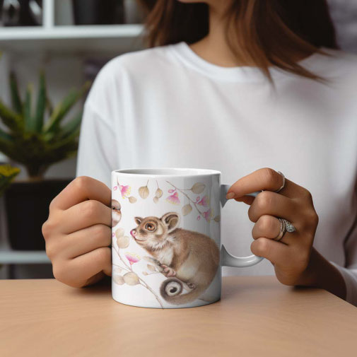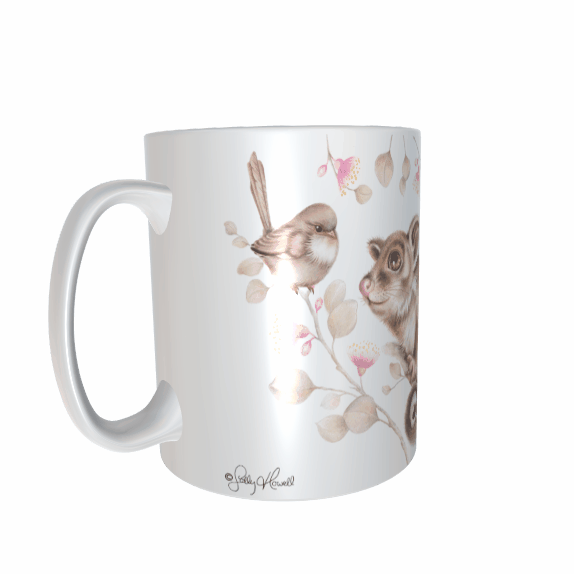 This beautiful ceramic mug featuring Rosie Ringtail print by Artist Sally Howell is perfect for any event of the day.