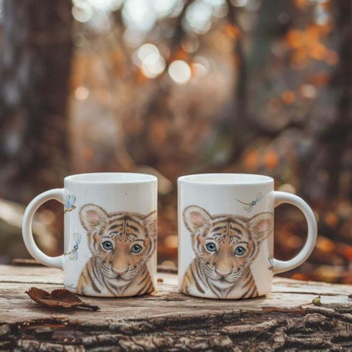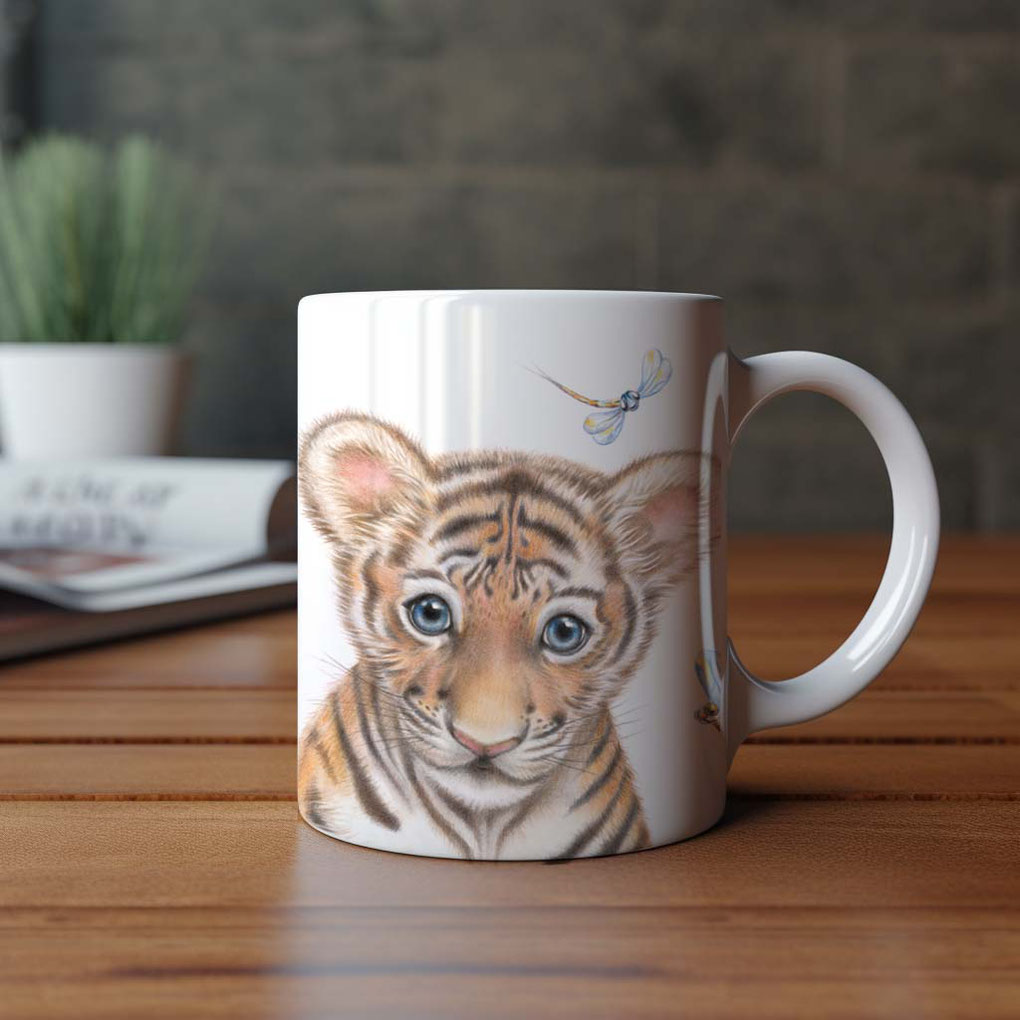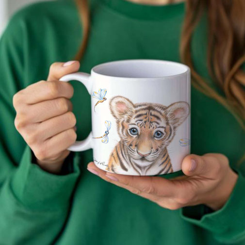This beautiful ceramic mug featuring Tiger Cub print by Artist Sally Howell is perfect for any event of the day.